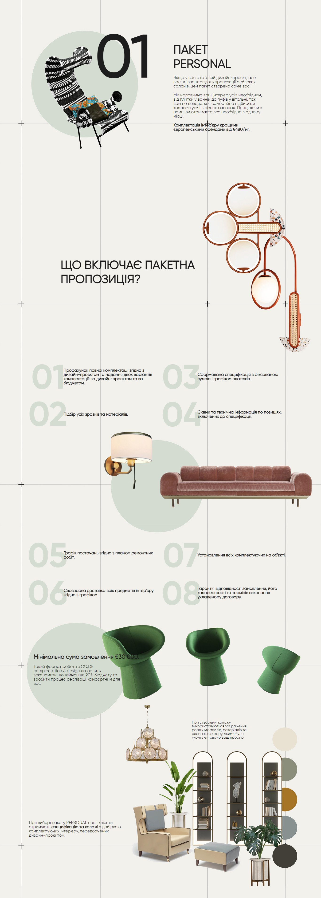 При виборі пакету PERSONAL наші клієнти отримують специфікацію та колажі з добіркою комплектуючих інтер'єру, передбачених дизайн-проєктом.